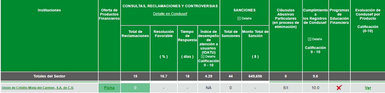 “La información corresponde únicamente a la Unión de Crédito Mixta del Carmen SA de CV para conocer la